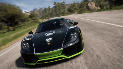 A black and green Porsche 918 Spyder hypercar racing through a scenic landscape in Forza Horizon 5.