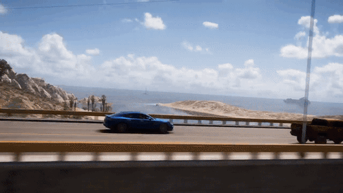 A blue Porsche Panamera Turbo drives through scenic coastal and desert roads in Forza Horizon 5.