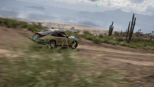 A custom Porsche Rothsport Racing 911 Desert Flyer rally car races off-road through a dusty desert landscape in Forza Horizon 5.