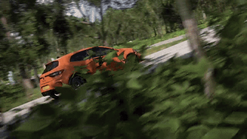 An orange Renault Megane RS speeds through a scenic road, overtaking other vehicles in Forza Horizon 5.