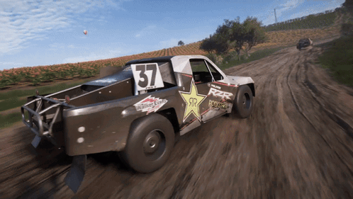 Rj Anderson's Polaris RZR Rockstar Energy Pro 2 Truck racing in Forza Horizon 5 off-road.
