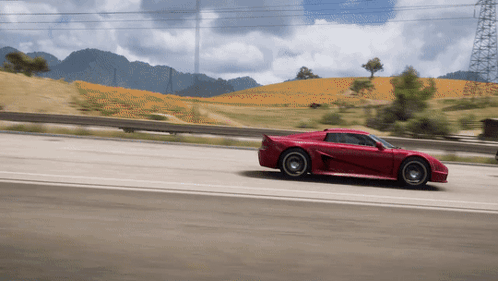 a red sports car is driving down a road