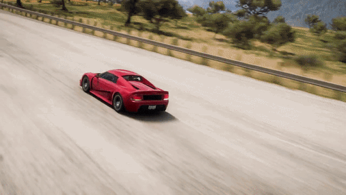 a red sports car is driving down a road with mountains in the distance
