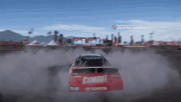 A red Toyota Camry race car performs smoky donuts and burnouts on a track in Forza Horizon 5.