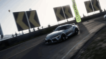 A Toyota GR Supra races on a track in Forza Horizon 5, passing checkpoint banners.