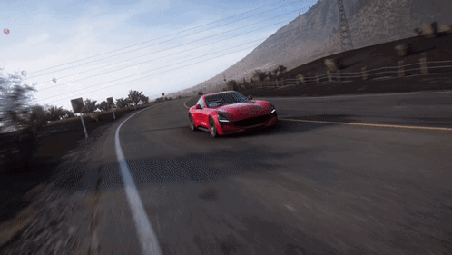 A sleek red TVR Griffith sports car speeds through scenic roads in Forza Horizon 5.