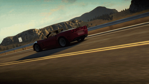A red Chevrolet Corvette Grand Sport convertible speeds along a scenic mountain road in Forza Horizon.
