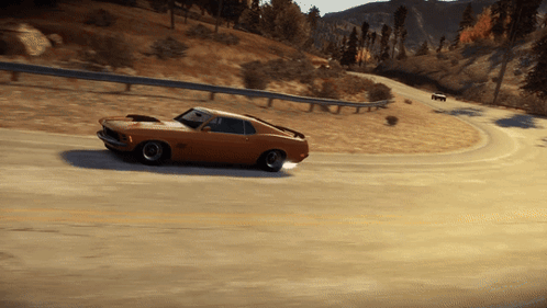 A classic Ford Mustang Boss 429 muscle car drives through scenic roads in Forza Horizon.