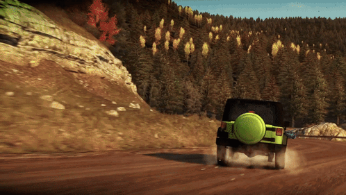 A vibrant green Jeep Wrangler Rubicon drifts and drives off-road on a dusty mountain track in Forza Horizon.
