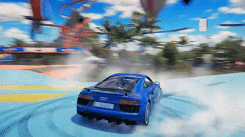 A blue Audi R8 V10 Plus performs impressive drifts and burnouts on a vibrant race track in Forza Horizon 3.