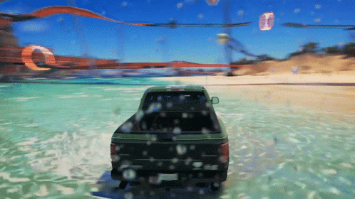 A green Ford F-150 Raptor pickup truck drives through shallow water on a sandy beach in Forza Horizon 3, creating splashes.