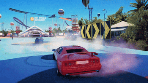 A red Lotus Esprit V8 drifts and spins on a vibrant Hot Wheels-themed track in Forza Horizon 3.