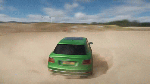 A green Bentley Bentayga SUV drifts through the sand in Forza Horizon 4.