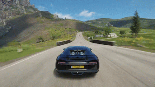 A sleek black Bugatti Chiron speeds through scenic mountain roads in the popular racing game, Forza Horizon 4.