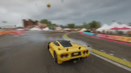 a yellow sports car is driving down a road