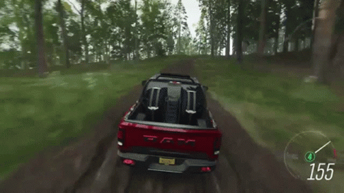 A red Ram truck drives off-road through a forest in the video game Forza Horizon 4.
