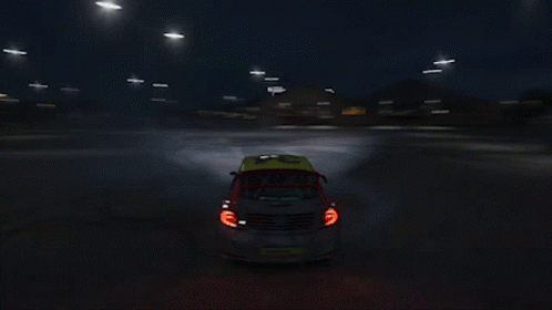 A yellow and red Volkswagen Beetle rally car drifts and spins on a dark track in Forza Horizon 4.