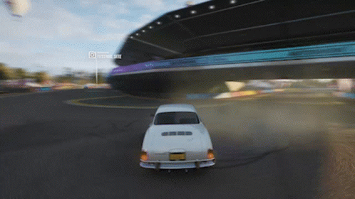 A white Volkswagen Karmann Ghia drifts and performs burnouts under a bridge in Forza Horizon 4.