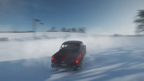 Red Volkswagen Type 3 1600L car drifting through a snowy landscape in Forza Horizon 4, kicking up snow.