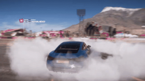Blue Audi RS e-tron GT performs a smoky burnout and drifts at the Forza Horizon 5 festival in Mexico.