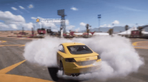 A yellow Audi TTS Coupe performs an impressive drift and burnout at the Horizon Festival in Mexico.