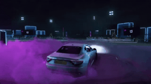 A white Maserati Gran Turismo S drifts with vibrant purple tire smoke in Forza Horizon 5.