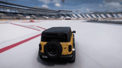 A yellow Ford Bronco drives on an icy track in Forza Horizon 5, showcasing winter driving.