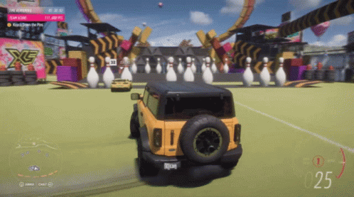 A yellow Ford Bronco drives through a custom bowling event, knocking down giant pins in Forza Horizon 5.