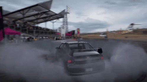 A Mitsubishi Lancer Evolution IX MR performs impressive drifts and donuts on a track in Forza Horizon 5.