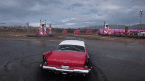A classic red and white Plymouth Fury performs impressive drifts and donuts on a wet track in Forza Horizon 5.
