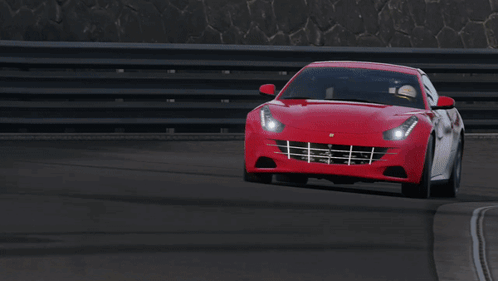 A red Ferrari FF speeds around a race track in the video game Forza Motorsport 7.
