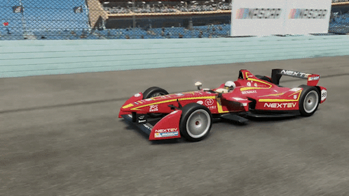 A red and yellow Formula E Nextev TCR FE01 race car on the track in Forza Motorsport 7.