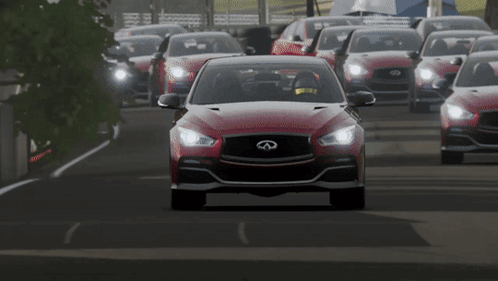 Multiple red Infiniti Q50 Eau Rouge cars race on a track in Forza Motorsport 7, showcasing high-speed gameplay.