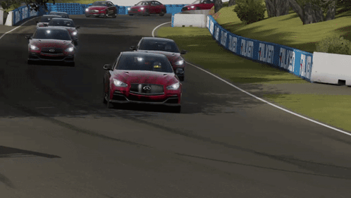 A red Infiniti Q50 Eau Rouge sports sedan races on a track in Forza Motorsport 7.