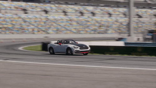 a convertible car is driving on a race track