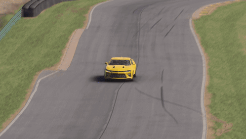 A vibrant yellow Chevrolet Camaro Super Sport speeds around a track in the video game Forza Motorsport.