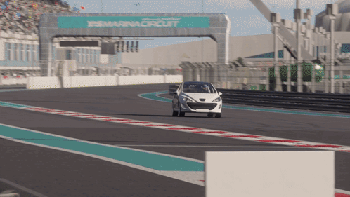 a white car is driving down a race track with a sign that says ys marina circuit