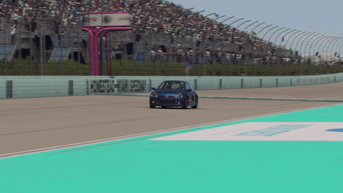 a blue car is driving on a race track with a green stripe