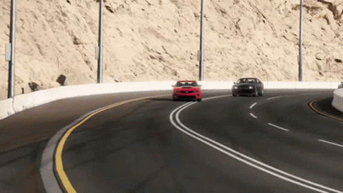 Red Chevrolet Camaro ZL1 and other muscle cars racing on a desert highway in Forza Motorsport 7.