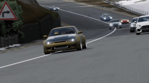 A gold Nissan Silvia Spec R drifts and drives on a scenic mountain road in the game Forza Motorsport 7.