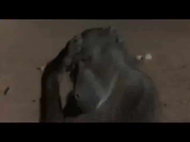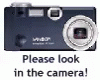 A black digital camera displays prompts to look into the camera, followed by a timer and a 'Please wait' message.