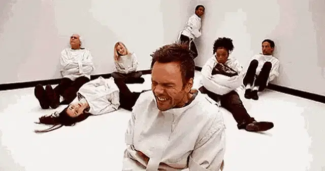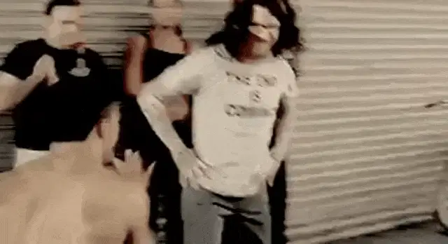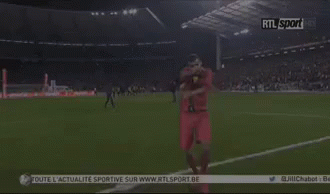 Stromae, dressed in a red and yellow kit, makes an intense face and points at the camera on a soccer field.