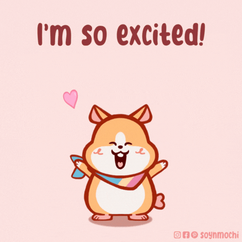 An adorable animated hamster with a rainbow scarf jumps with joy, exclaiming 'I'm so excited!'
