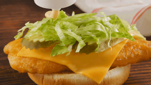 Close-up of a Freddy's Deluxe Crispy Fish Sandwich being assembled with cheese, lettuce, pickles, and sauce.