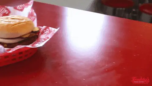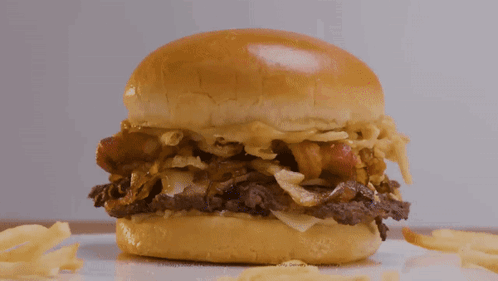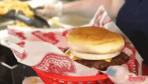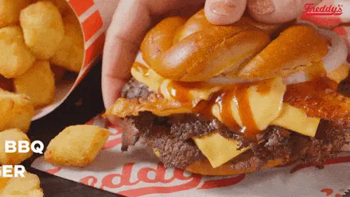 A close-up of the new Freddy's French Onion Steakburger, featuring crispy onions and a juicy patty, served with golden fries.