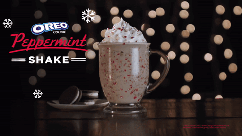 Enjoy Freddy's festive Oreo Cookie Peppermint Shake, topped with whipped cream and sprinkles, perfect for the holidays.
