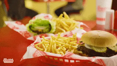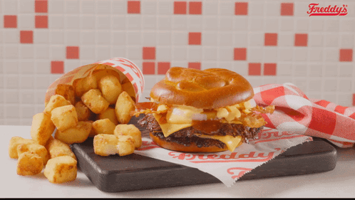 Freddy's Pretzel Bacon BBQ Steakburger with crispy tater tots, a delicious fast-food meal.