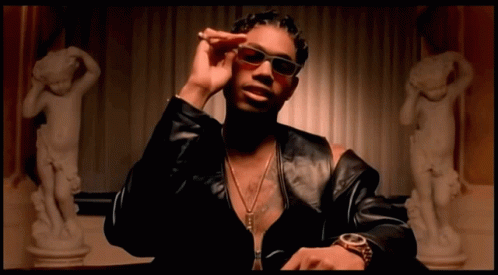 A stylish man, possibly Devante Swing or another Jodeci member, wearing sunglasses and a leather vest, sits in a luxurious room.