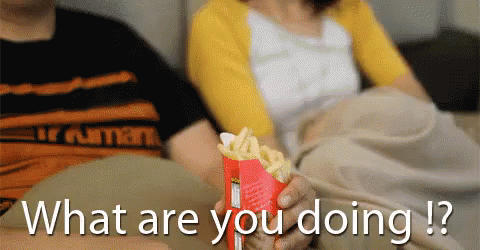 A person's reaction to someone taking their french fries, with the caption 'What are you doing !?'