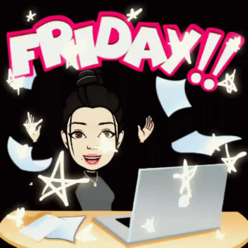 Animated woman celebrating Friday with a laptop and flying papers, ready for the weekend.